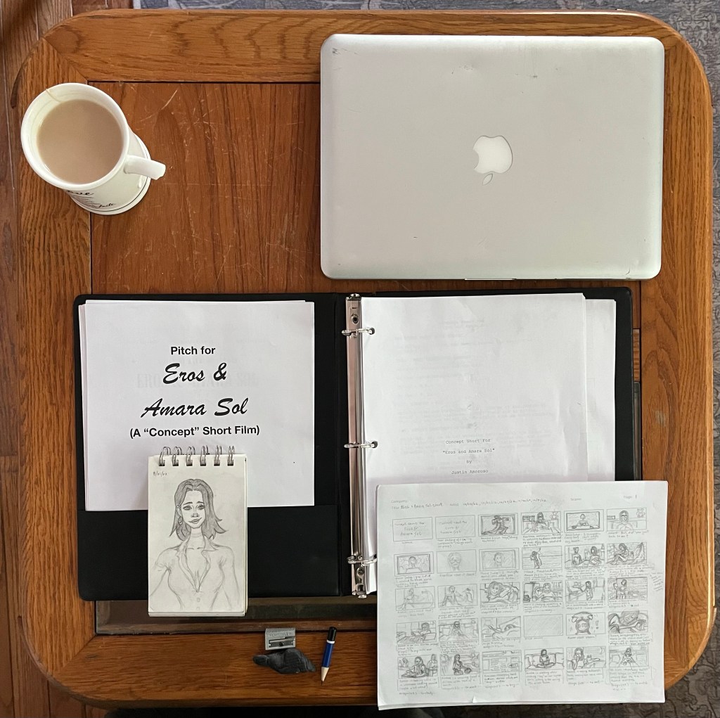That’s why I storyboarded the script (December, 2022 – first week of April, 2023). And put the drawings together in iMovie—which took me a month (longer than I thought it would take).